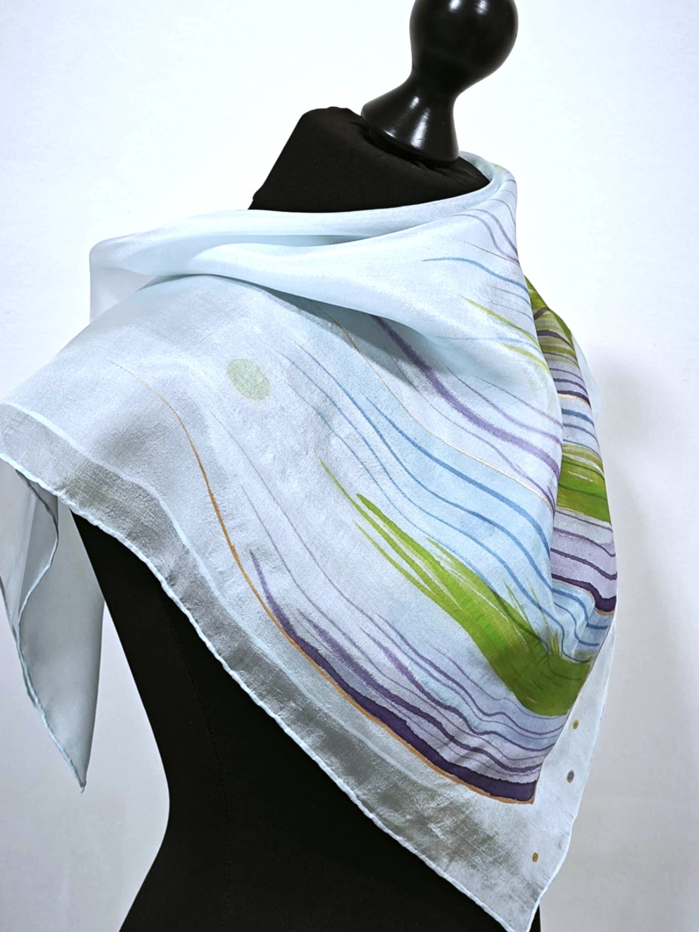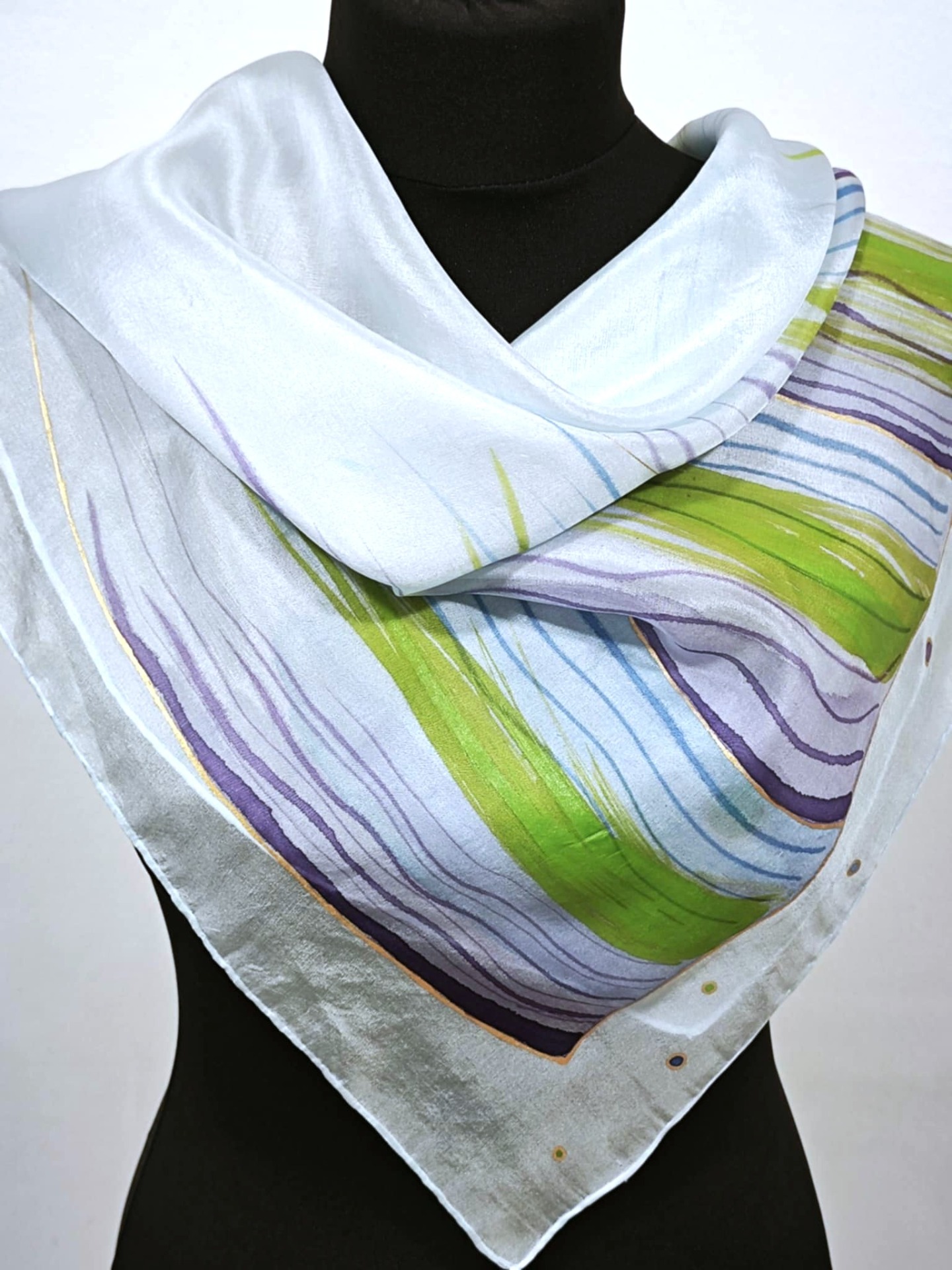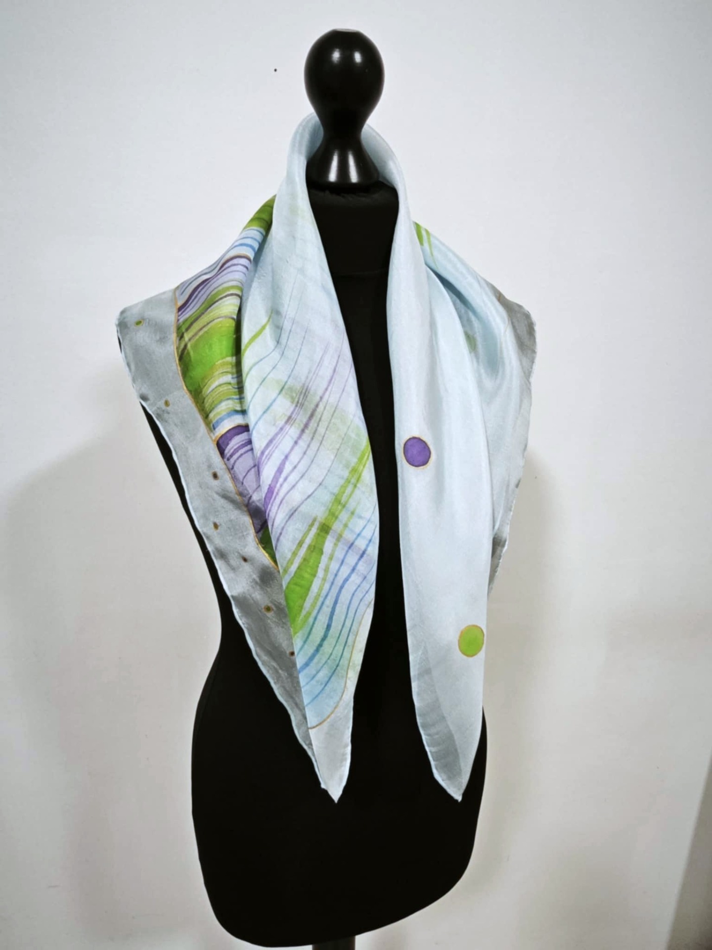 Anyaga: 100 % hernyóselyem pongé5, kézzel festve, hővel fixálva. Mérete: 74x74 cm. Színei: halványkék és árnyalatai, lila, élénk zöld, arany kontúrral. Használati útmutató: mosás langyos vagy hideg vízben csavarás nélkül, szárítás függesztve vagy törölközőre terítve, vasalás félig nedvesen a hátoldalán silk (langyos) fokozaton.