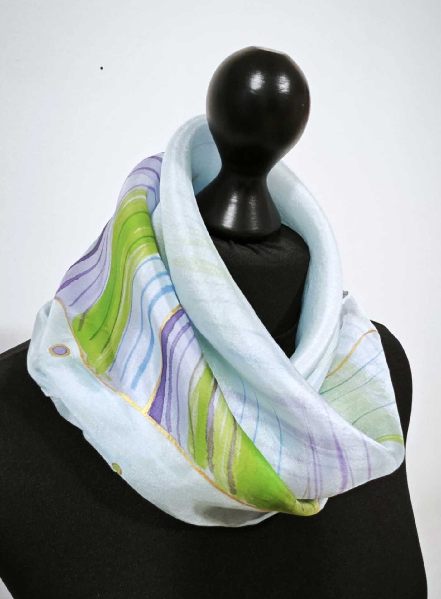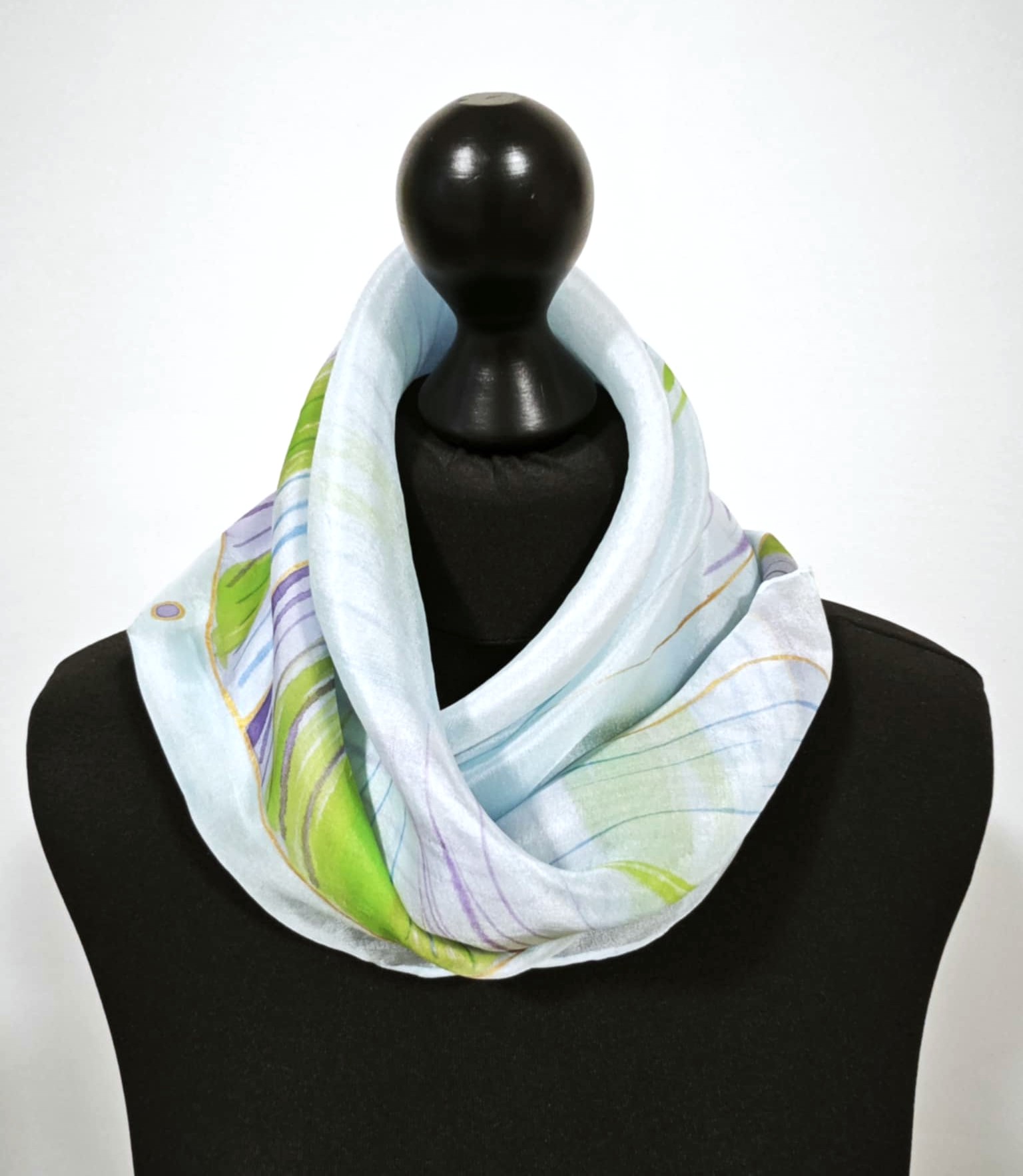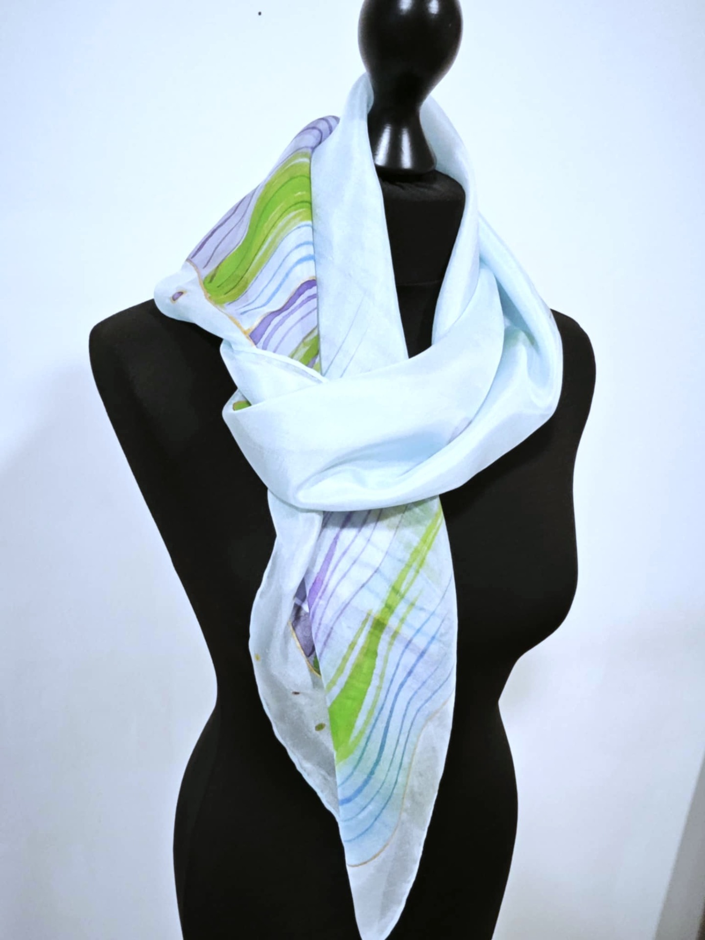 Anyaga: 100 % hernyóselyem pongé5, kézzel festve, hővel fixálva. Mérete: 74x74 cm. Színei: halványkék és árnyalatai, lila, élénk zöld, arany kontúrral. Használati útmutató: mosás langyos vagy hideg vízben csavarás nélkül, szárítás függesztve vagy törölközőre terítve, vasalás félig nedvesen a hátoldalán silk (langyos) fokozaton.